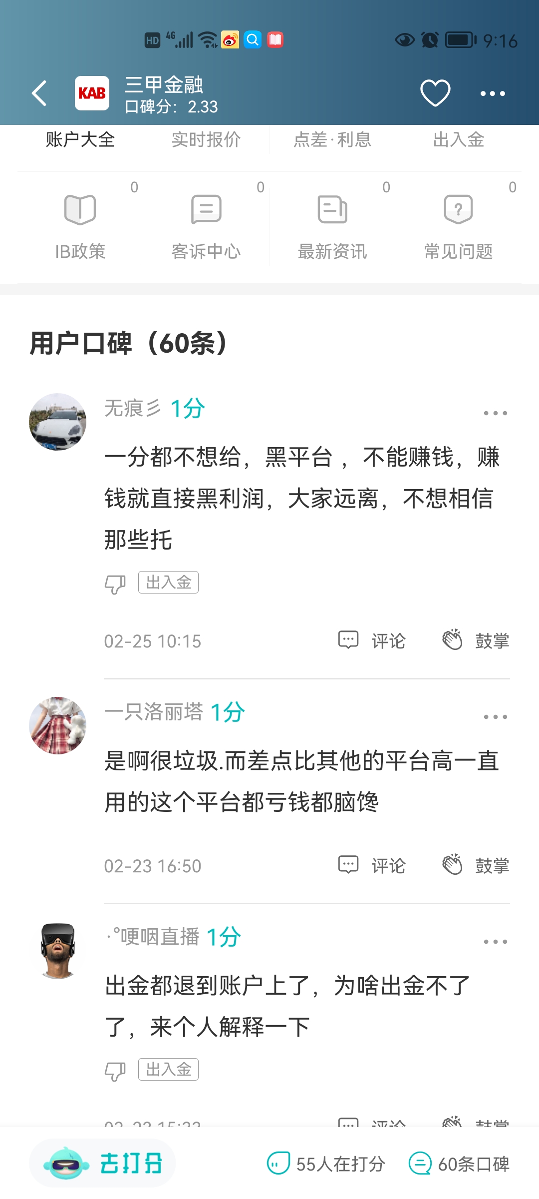 三甲金融是垃圾平台榜的常驻交易商。其一直不注重用户体验,点差比其他平台高一大截、出金也不够流畅,有用户气愤到直接说它是“黑平台”。