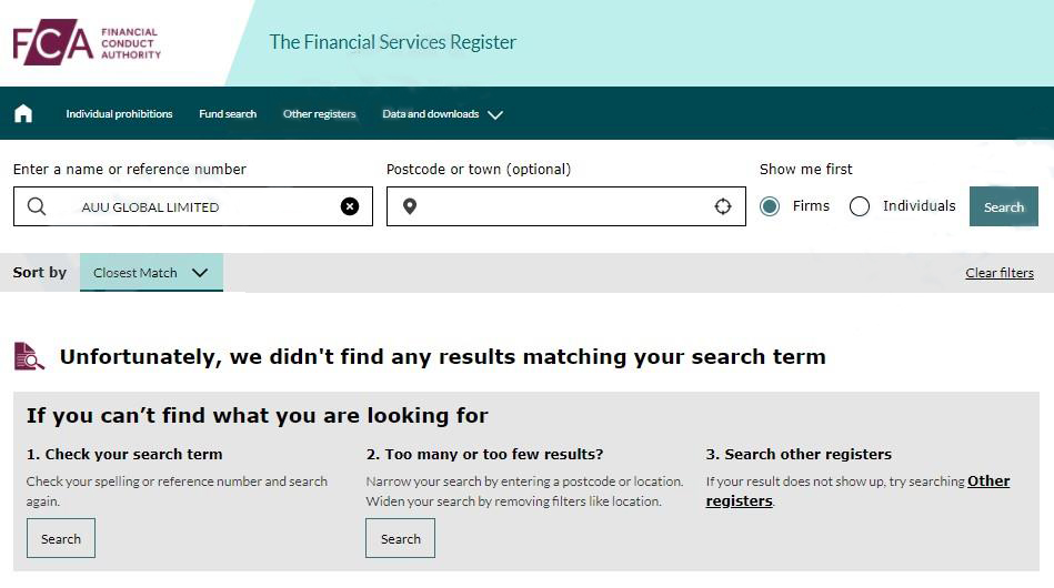 通过调查,我们发现英国工商局官网查询确有一家AUU GLOBAL LIMITED登记。但请注意:有注册不代表有监管!在英国FCA官网输入“AUU GLOBAL LIMITED”,查无任何结果,也就是说,它没有获得英国金融行为管理局FCA的监管,是一家没有监管的黑平台。