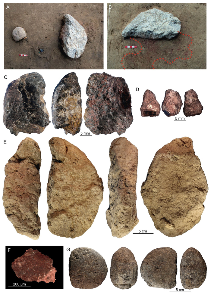 工作会上,据国家文物局介绍,蔚县下马碑遗址第6层堆积距今4.1万年至3.9万年,考古发现赤铁矿石、火塘及其周边散落的石器、骨器及动物化石碎片等。考古人员根据拉曼光谱、X射线荧光光谱等技术分析,确认一处富集赤铁矿的染色区,部分赤铁矿石表面发现摩擦痕迹,推测为颜料加工遗存。