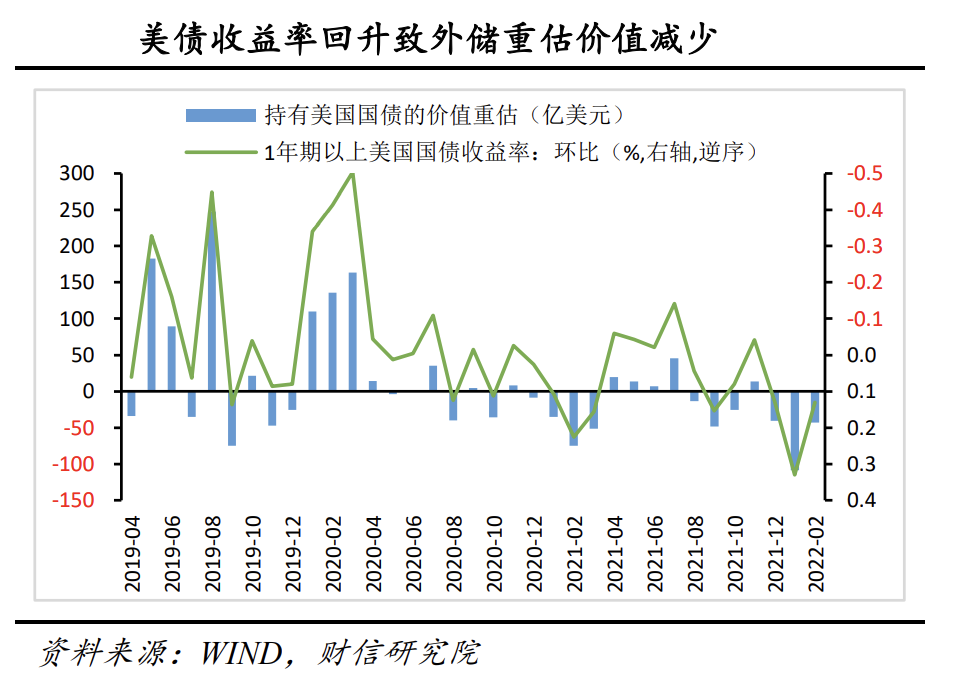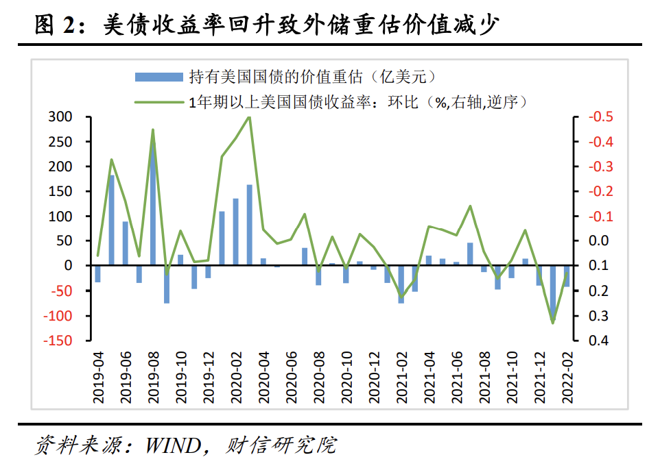 一是美债收益率上升,估值下降,致外储减少43亿美元左右,加上利息收益48亿美元,共使外储增加约5亿美元。2021年12月份我国持有的美国国债10687亿美元,约占外储规模的三分之一,美国国债价格变动对我国外汇储备规模具有重要影响。引起美国国债价格变动的主要因素是利率,2022年2月末美国1年期以上国债收益率环比约提高0.13%,美国国债价格下跌,预计使我国外汇储备减少43亿美元(见图2)。此外,还应加上2月份美国国债的应计利息收入,预计在48亿美元左右。两项相加,共导致外储增加约5亿美元。