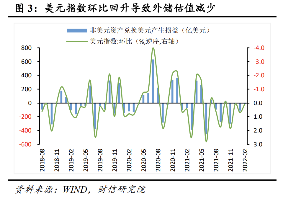 二是美元指数走高,非美元货币相对美元贬值,汇率折算造成的汇兑损失在12亿美元左右。1月末、2月末美元指数分别为96.64和96.71,环比提高0.07%(见图3)。通过估算,2月份美元升值导致非美元资产兑换为美元时产生汇兑损失12亿美元左右。