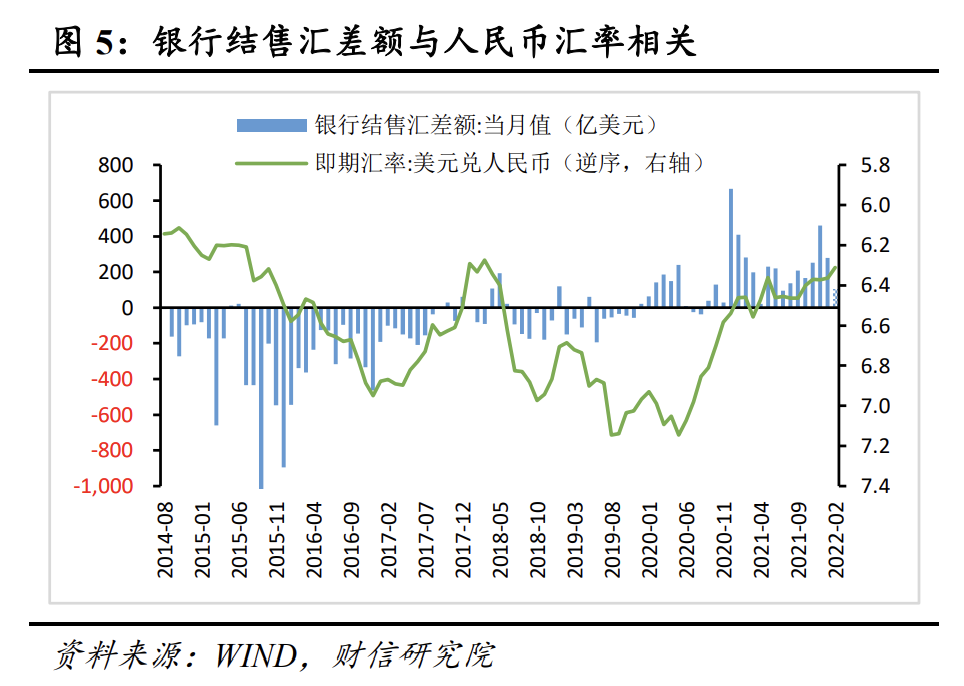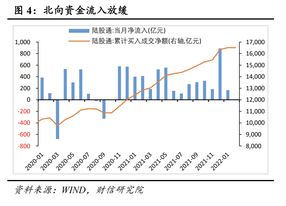 一是预计2月份境外机构配置人民币资产规模基本不变。疫后境外机构加速配置人民币资产,引发外储规模变动,但2022年以来国内资本市场波动加大,外资流入放缓。如2021年12月、2022年1月、2月份北向资金持有股票规模环比分别增加890、168、6亿元(见图4),外资流入有所放缓。预计2月境外机构资产配置效应对外储规模影响较小,基本为零。