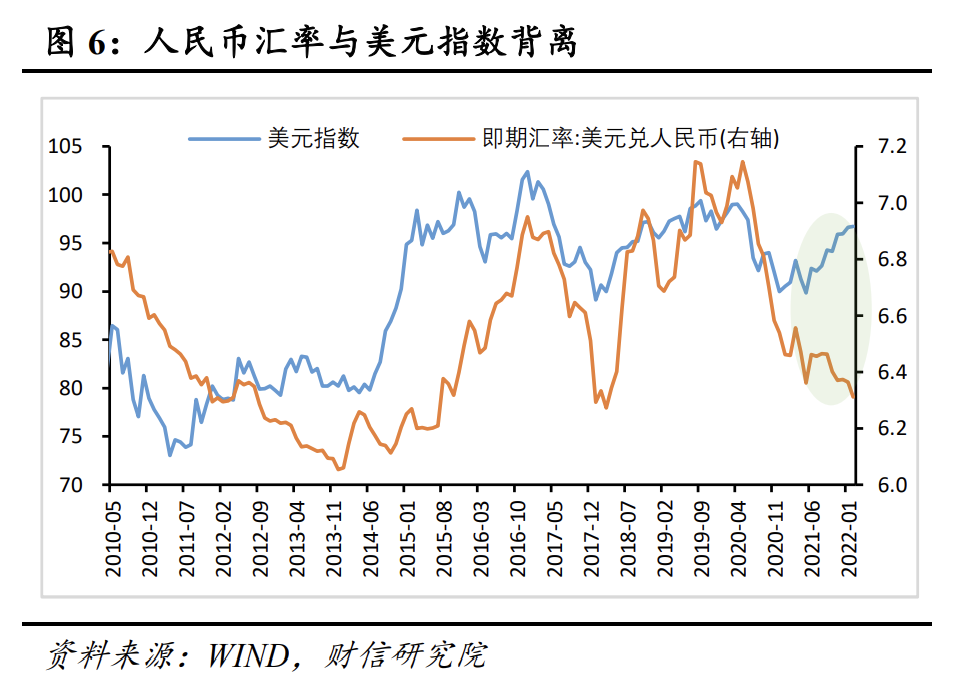 二是美联储加息预期增强叠加中美经济周期错位,致人民币升值预期有所减弱,预计结售汇顺差收窄至100亿美元左右。从短期看,影响我国企业和居民银行结售汇行为的原因,主要是美元兑人民币汇率的变化。通过比较美元兑人民币汇率与企业居民的银行结售汇差额的历史数据,发现人民币升值趋势越明显,银行结售汇顺差越大(见图5)。人民币汇率长期走势与美元指数高度相关,但近期受出口持续强势贸易顺差较大和人民币避险资产属性增强影响,人民币强势特征明显,二者出现背离(见图6)。往后看,我国经济下行压力仍然较大,出口边际下行,加上美联储加息预期增强,美元走高,预计汇率双向波动性将有所增强。预计2月份银行结售汇顺差有所收窄,在100亿美元左右。
