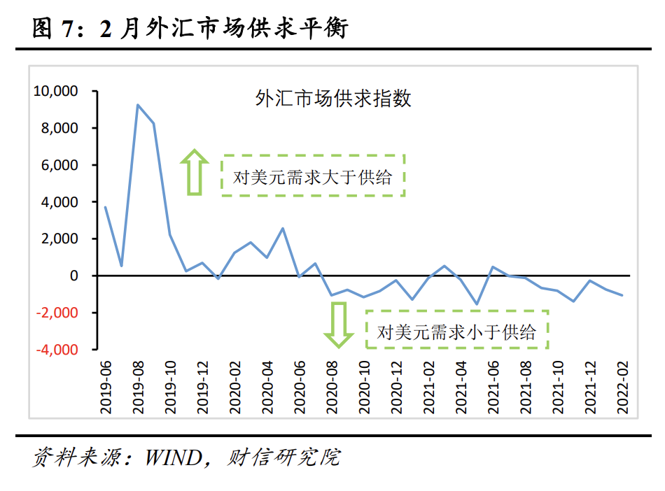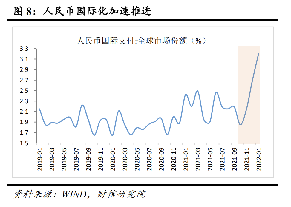 三是外汇市场供求平衡,人民币国际化提速,央行干预动因不强。从跨境资金流动看,2月份外汇市场的高频监测指标显示,国内外汇市场对美元需求小于供给(见图7),供求平衡性较好,央行干预动因不强;人民币国际化提速(见图8),汇率市场化程度提高。预计2月份央行为满足市场主体用汇需求等而损耗的外汇储备保持稳定,在170亿美元左右。