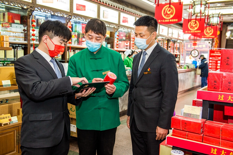今年初,为适应北京市前门大栅栏老字号企业线上商城结算需求,工行北京大栅栏支行积极与张一元茶叶有限责任公司网上销售系统对接,在企业线上销售结算中注入新型工行线上支付产品,丰富了企业线上商城结算方式。图为该行工作人员在北京张一元门店现场指导商户使用该行结算系统。  本报记者 刘志良 摄
