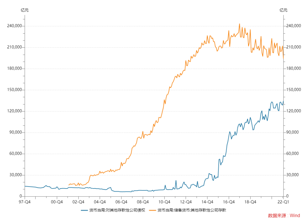 进一步来说,中国央行依靠赚钱的资产主要有两大块:一是国外资产赚的钱,包括外汇储备经营收益(1万亿利润主要来源)和汇率变动带来的损益等;二是向其它金融机构再贷款、再贴现的利息收入,专项再贷款利息收入等。需要付出成本的则主要是给各项存款包括其他存款性公司存款(法定存款准备金和超额存款准备金)、政府存款、第三方支付机构的存款等。单纯从存贷款利差来看,比如中国MLF(中期借贷便利)的再贷款利率长期在3%左右,但是存款利率、超储利率只有0.35%,法定存准利率也只有1.62%。法定存款准备金率过去一直很高,最高到20%以上,不断降准后金融机构平均存款准备金率为8.4%。这意味着中国的银行系统长期以来存在着一个怪异的现象:一方面,商业银行大量的准备金,以1.6%左右的利率被锁在法定准备金的账户里不能使用,另一方面却不得不以3%左右的高利率向央行再贷款。这种扭曲的资产负债结构有其特定的金融环境原因(外汇占款大量涌入停止),同时也是央行利润赚取的重要来源。