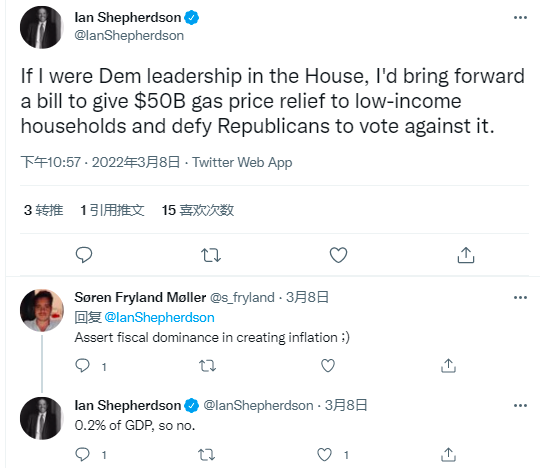 经济研究顾问公司Pantheon Macroeconomics的首席经济学家伊恩?谢泼德森(Ian Shepherdson)周二发推表示:“如果我是众议院民主党领袖,我会提出一项议案,为低收入家庭提供500亿美元的油费减免,不顾共和党人投票反对。”