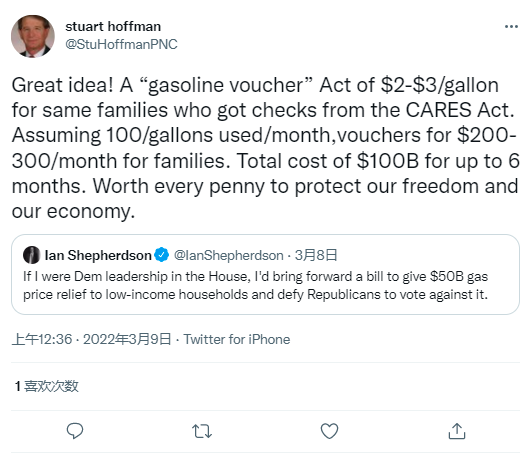 霍夫曼发推称,假设这些家庭每月为他们的汽车加100加仑的油,每加仑给2到3美元的减免,可能代表每个家庭每月领200到300美元。“6个月的总成本为1000亿美元。为了保护我们的自由和经济,每一分钱都值得。”他称。