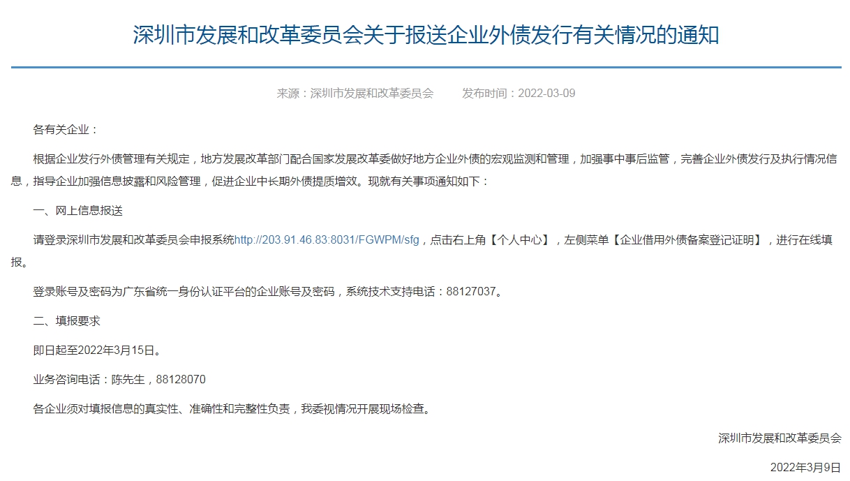 中新经纬3月9日电 3月9日,深圳市发改委发布关于报送企业外债发行有关情况的通知,要求有关企业在线填报企业外债发行有关情况。填报时间为,即日起至2022年3月15日。