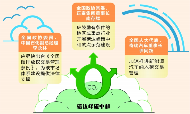 今年全国两会上,如何推进双碳目标顺利实施,仍是代表委员的热议话题。多位代表委员建议,全国碳排放权交易市场应继续尽快出台顶层文件来做好碳配额分配工作,为碳市场体系建设提供法律支撑;可再生能源行业等应出台更多财税金融支持政策,激发市场活力;在继续做好重点行业碳减排工作的同时,也要注重新能源汽车等新兴领域的节能减碳工作。