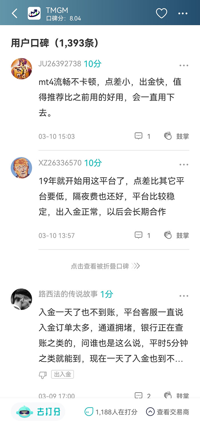 TMGM成立于2013年,目前持有澳大利亚ASIC、瓦努阿图VFSC、新西兰FMA三国金融牌照。有汇友用过多年后,依然对平台的点差、出金速度等很满意。但最近有用户反应其入金速度比以往慢,TMGM给出的原因是“受国际形势影响,入金通道繁忙”,其他知名平台最近也曾出现入金无法及时到账的问题。