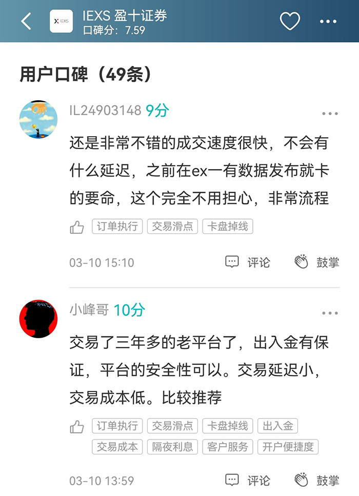 IEXS盈十持有英国FCA的STP直通式牌照和瓦努阿图VFSC牌照。用户对其评价主要包括:交易速度快,延迟小;出入金有保证等方面。