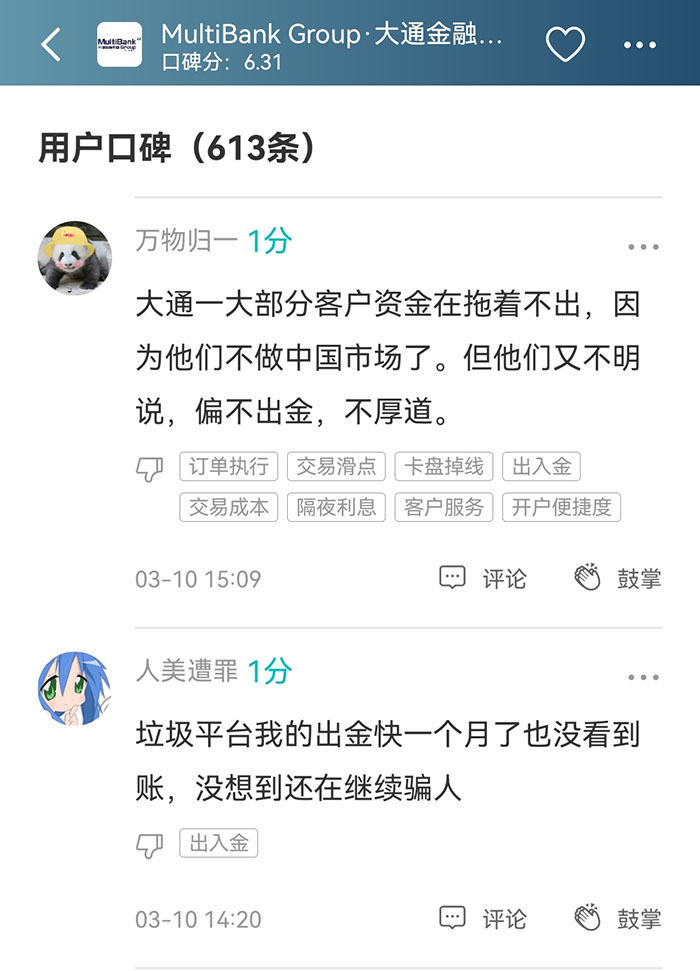 现在打开看大通金融的页面,显示是“大量客诉”的状态。底下也都是汇友在吐槽出金久久不成功的。大通成为垃圾榜第一名,一点不奇怪。