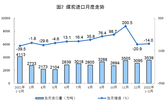原煤生产较快增长,进口降幅收窄。1—2月份,生产原煤6.9亿吨,同比增长10.3%,增速比上年12月份加快3.1个百分点,日均产量1164万吨。进口煤炭3539万吨,同比下降14.0%,降幅比上年12月份收窄6.9个百分点。