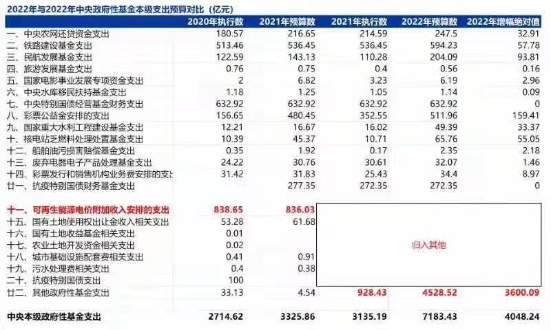 截至2021年底,可再生能源发电补贴拖欠累计在4000亿元左右。根据《2022年中央政府性基金支出预算表》中明确“中央本级支出”增加至4528亿元,解决可再生能源补贴或许已不是问题。