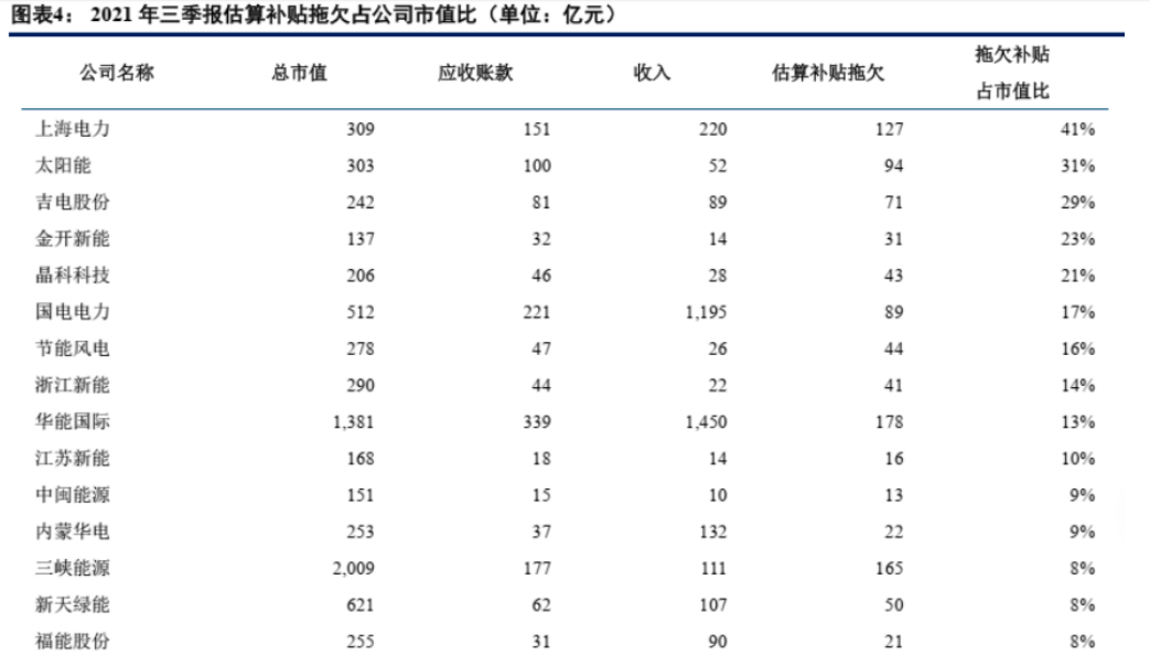 中信建投证券测算了截止至2021年三季报可再生能源附加的欠缴金额与市值的比例如下:
