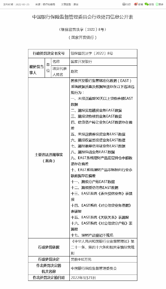 近日,国家开发银行监管标准化数据(EAST)系统数据质量及数据报送存在17项违法违规行为,被银保监会处罚440万元,具体处罚如下: