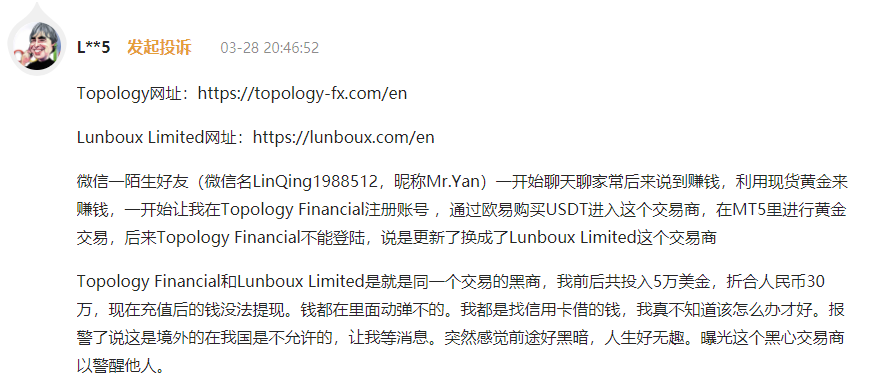 近日,一位汇友的投诉揭开了Lunboux Limited和Topology Financial两个平台之间的关系。