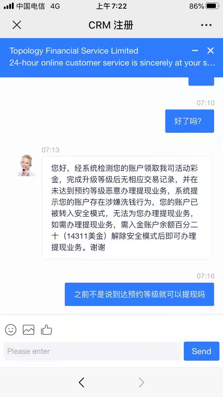 提现时,Topology 客服开始找各种理由拒绝出金:先是说出金会导致失去送彩金活动资格,后来又说提现次数过多,需要重新激活账户。而激活账户则要再充值一笔与上笔充值同等金额的资金。