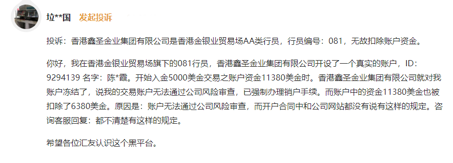 早在2020年,有位陈女士就在鑫圣金业入金5000美金,当她的账户资金盈利到11380美金时,鑫圣金业就冻结了她的账户,以“交易账户无法通过公司风险审查”为由,强行给她办了销户手续。至于陈女士账户的11380美元资金,被鑫圣金业扣掉了6380美元。