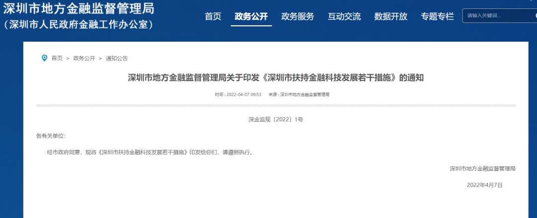 4月7日,深圳市地方金融监督管理局发布关于印发《深圳市扶持金融科技发展若干措施》的通知,通知提出,抢抓金融科技发展机遇,加快金融科技产业升级,助力深圳打造全球金融科技中心。鼓励深圳市金融科技类企业创新发展,做大做强。支持优质金融科技类企业上市融资。