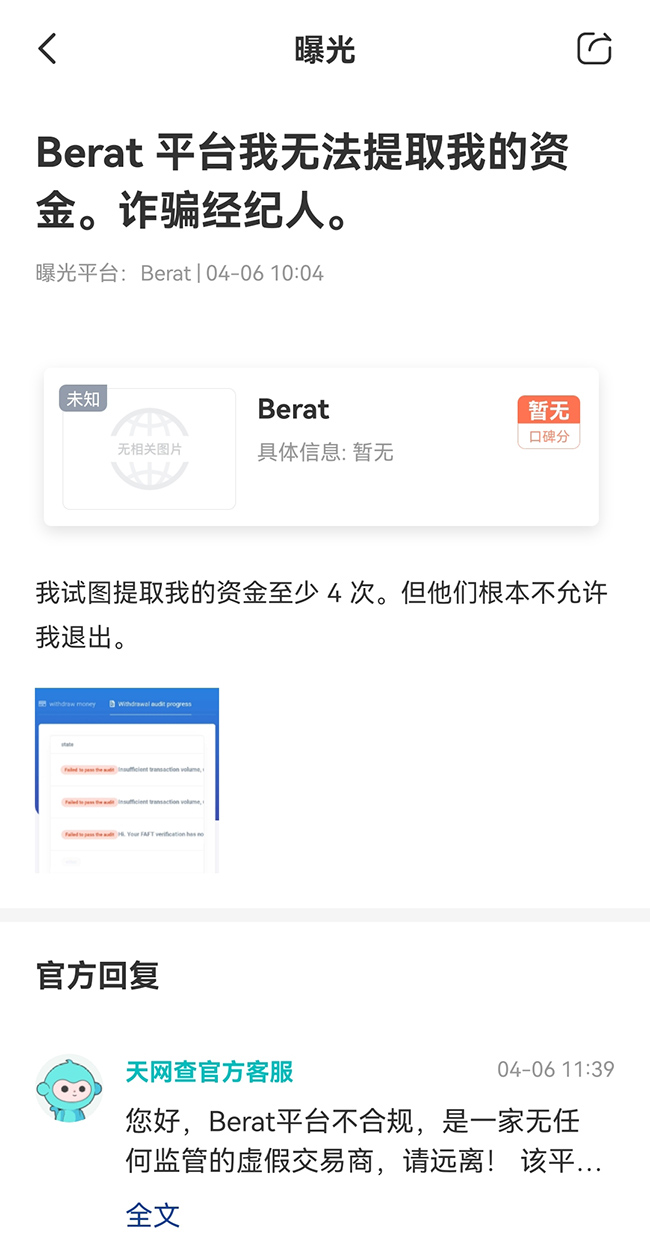 近日天网查收到的一则汇友投诉,投诉对象就利用这一点来包装自己。但实际别说金融服务补偿了,汇友4次申请提现,4次平台都不通过,根本无法出金。而这个平台就是——Berat。