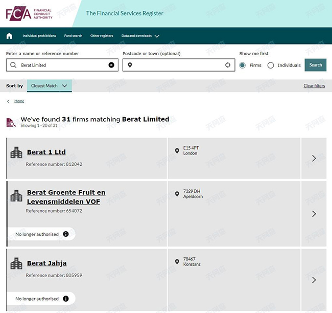 可见,想要获得FSCS的保护,首先交易商要是受英国FCA监管的公司。但我们在FCA官网查询“Berat”,并未查询到相对应的公司,显然平台宣称的FSCS保险是虚假宣传。