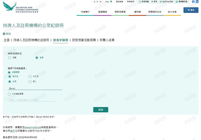 那既然Berat的公司地址在香港,是否受香港SFC监管呢?在香港工商局官网我们查到了Berat Limited的注册信息;但SFC官网输入“Berat”,却查无任何结果。显然,Berat也不受香港SFC监管。