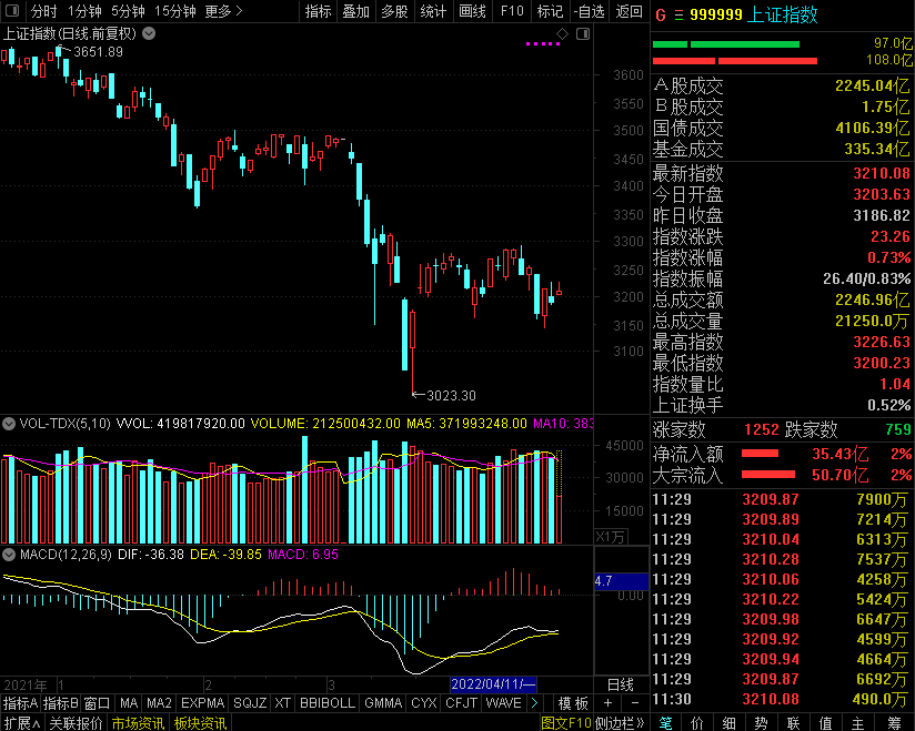 4月14日,三大指数早盘分化,上证指数震荡反弹,创业板指盘中跳水再创年内新低。盘面上,新冠检测板块大涨,九安医疗(002432)3连板股价创历史新高。白酒板块震荡走强,皇台酒业涨停。下跌方面,智飞生物(300122)受利空影响盘中跳水大跌超18%,这也是创业板指盘中跳水的主要原因之一。总体上个股涨多跌少,两市超2800只个股上涨。沪深两市半日成交额达5039亿,较上个交易日上午缩量338亿。
