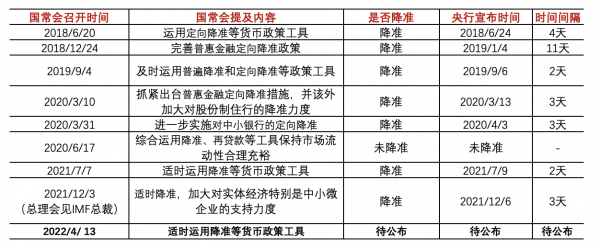具体来看,4月13日的国常会提到“适时降准”,政策措辞同2021年7月、12月类似:2021年7月7日,国常会提出“适时运用降准等货币政策工具”,两天后央行宣布降准;2021年12月3日,总理在会见国际货币基金组织总裁格奥尔基耶娃时所表示“适时降准,加大对实体经济特别是中小微企业的支持力度”,3天后央行宣布降准。