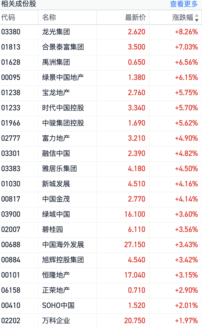 其中以龙光集团(03380.HK)、合景泰富集团(01813.HK)为首涨幅居前。