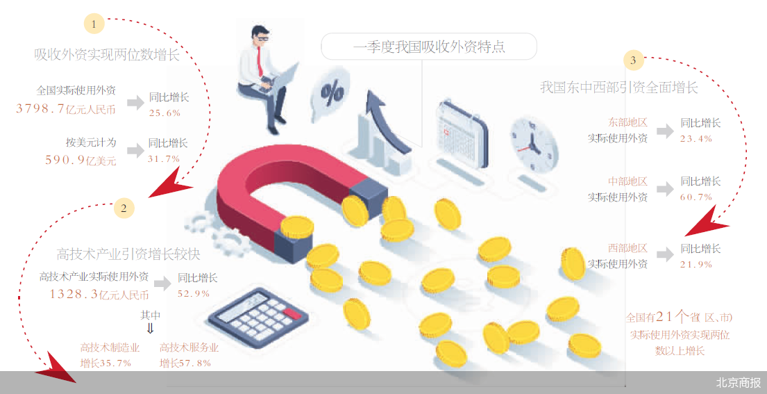 数据显示,一季度我国高技术产业引资增长较快,高技术产业实际使用外资1328.3亿元人民币,同比增长52.9%。其中,高技术制造业增长35.7%,高技术服务业增长57.8%。