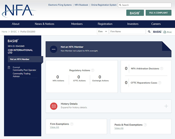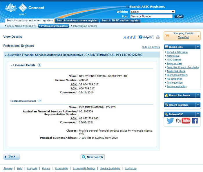 但经天网查核实,美国NFA 0541849公司名称为CKB INTERNATIONAL LTD,但不是美国NFA会员,且不受其监管。查询澳大利亚ASIC001292509对应公司名称为CKB INTERNATIONAL PTY LTD,登记为授权代表,但未登记网址。