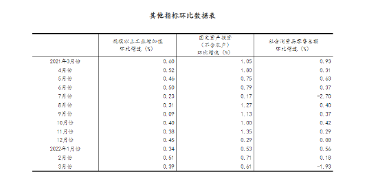 (2)根据季节调整模型自动修正结果,对近一年来各期国内生产总值、规模以上工业增加值、固定资产投资(不含农户)、社会消费品零售总额环比增速进行修订。修订结果及2022年一季度GDP环比数据、2022年3月份其他指标环比数据如下: