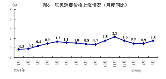 一季度,全国居民消费价格(CPI)同比上涨1.1%。其中,城市上涨1.2%,农村上涨0.7%。分类别看,食品烟酒价格同比下降1.3%,衣着价格上涨0.5%,居住价格上涨1.4%,生活用品及服务价格上涨0.6%,交通通信价格上涨5.5%,教育文化娱乐价格上涨2.6%,医疗保健价格上涨0.6%,其他用品及服务价格上涨0.7%。在食品烟酒价格中,粮食价格上涨1.7%,鲜果价格上涨6.9%,鲜菜价格上涨3.7%,猪肉价格下降41.8%。扣除食品和能源价格后的核心CPI同比上涨1.2%。3月份,全国居民消费价格同比上涨1.5%,涨幅比上月扩大0.6个百分点;环比持平。