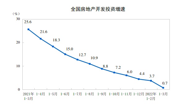 1—3月份,全国房地产开发投资27765亿元,同比增长0.7%;其中,住宅投资20761亿元,增长0.7%。