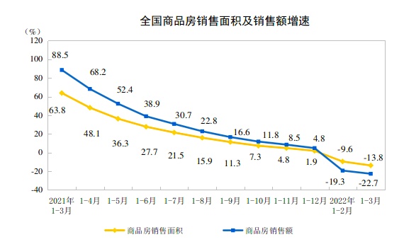 1—3月份,商品房销售面积31046万平方米,同比下降13.8%;其中,住宅销售面积下降18.6%。商品房销售额29655亿元,下降22.7%;其中,住宅销售额下降25.6%。
