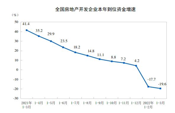 1—3月份,房地产开发企业到位资金38159亿元,同比下降19.6%。其中,国内贷款5525亿元,下降23.5%;利用外资10亿元,下降7.8%;自筹资金12395亿元,下降4.8%;定金及预收款12252亿元,下降31.0%;个人按揭贷款6369亿元,下降18.8%。