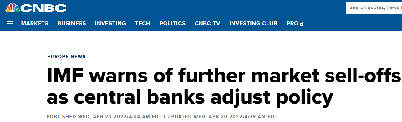 据美国消费者新闻与商业频道(CNBC)4月20日消息,国际货币基金组织(IMF)日前警告称,随着央行政策转向货币紧缩,各国开始对抗高通胀问题,并收紧疫情后的经济刺激措施。但是在资产市场上,这可能将进一步导致大量抛售的局面出现,让市场走向大跌。