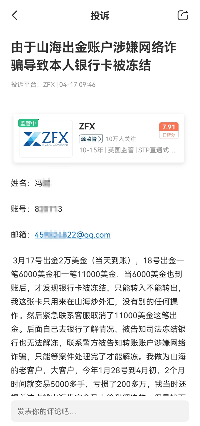 近日,天网查收到用户冯先生对ZFX山海证券的实名投诉(如下图所示):