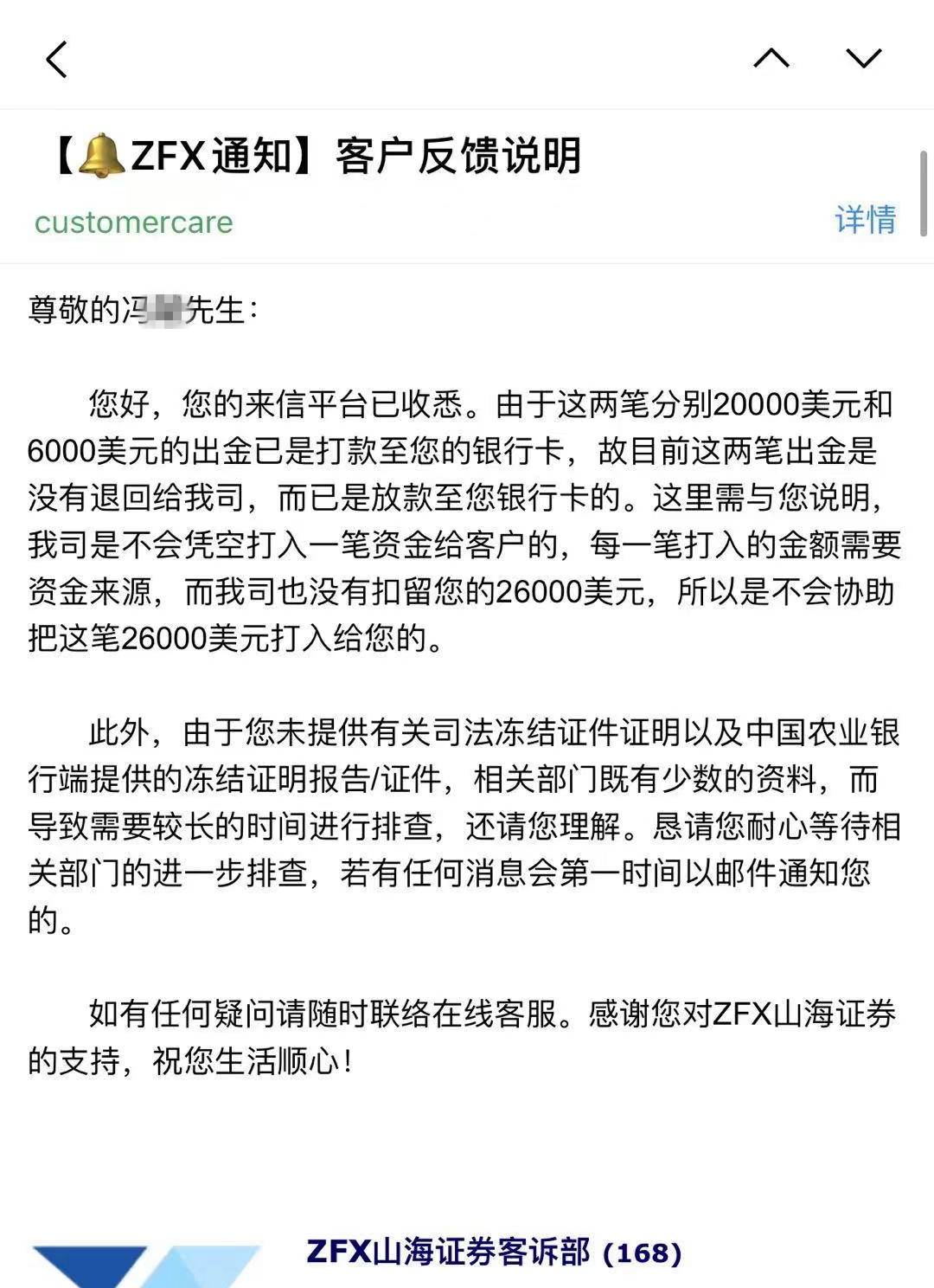但一个多月过去了,冯先生并没有受到ZFX山海证券给出的任何新进展。