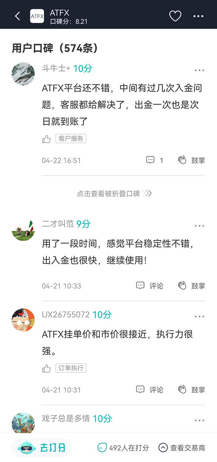 翻看ATFX的口碑评论区,汇友给出高分的点主要有:客服解决问题、平台稳定性不错、出入金快以及平台执行力很强等等多方面。