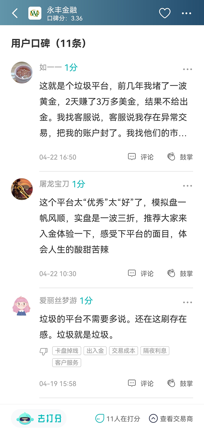 但这个老牌交易商最近处于“大量客诉”的状态,所以“荣”登垃圾平台榜第一名。汇友口碑区有几位汇友对其打出“1分”,有的汇友因为盈利30000美金不给出金;有汇友反应其模拟盘和实盘不相符;还有多位汇友反应其官网无法打开。