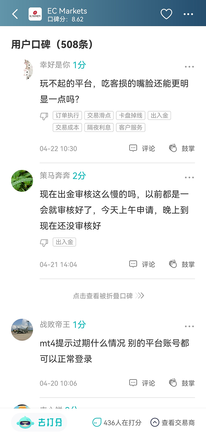 口碑方面,EC Markets最近几年本就负面频出。近期评价中,汇友也都给的差评,有人指责平台吃客损,有人指责其出金审核很慢。