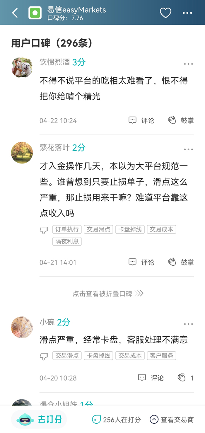 翻看它近期的口碑评论,有汇友评价“平台的吃相太难看,恨不得把你啃个精光”,又会有评价其止损单都滑点严重;有人称如果自动交易盈利了,平台就称禁止EA交易……负平非常之多。