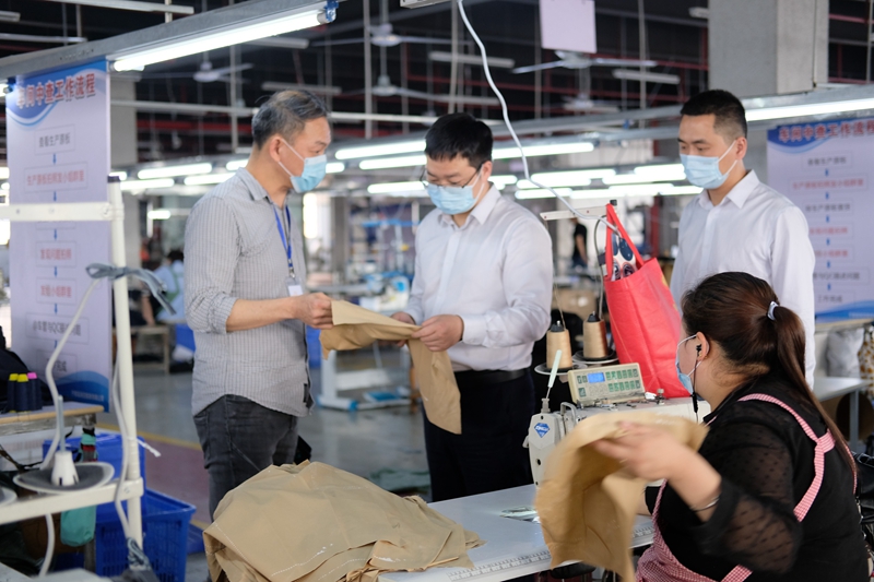 近年来,江西省赣州市于都县纺织服装产业高速发展,当地有纺织服装企业3000余家,全行业产值超过600亿元,被评为“全国纺织服装外贸转型升级基地”和“中国纺织服装产业园区联盟核心园区”。近期,由于海外生产停滞,出口订单不降反升,部分企业出现资金短缺,人行赣州市中支立即开展实地调研,通过深入车间走访掌握企业生产情况,指导辖内金融机构开通绿色通道,提供一揽子金融服务,切实为企业纾困解难。图为人行赣州市中支工作人员到企业走访。