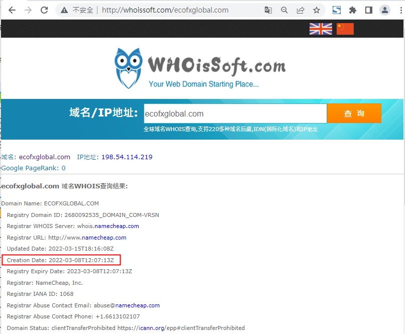 EcofxGlobal的官网是www.ecofxglobal.com,经过查询,发现该域名创建与2022年3月8日,可以说是非常新了。