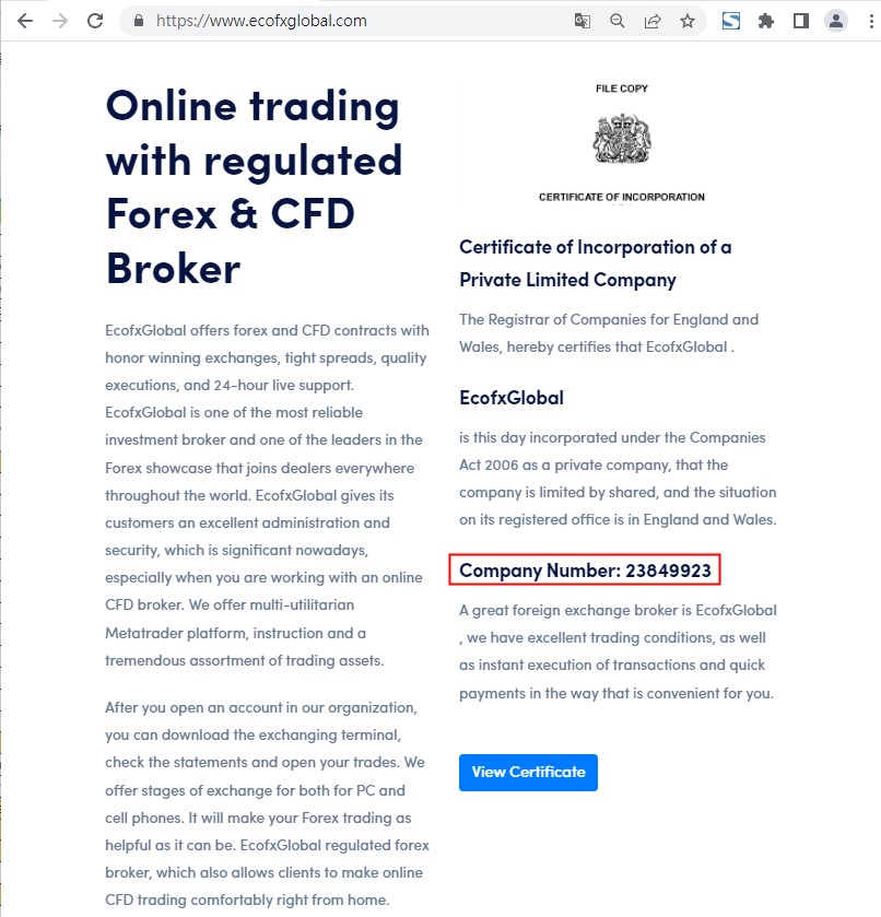 EcofxGlobal在官网宣称提供外汇、差价合约等交易服务,公司注册于英国,注册号是23849923,在官网宣称有监管,但却未说明是受哪个机构监管。