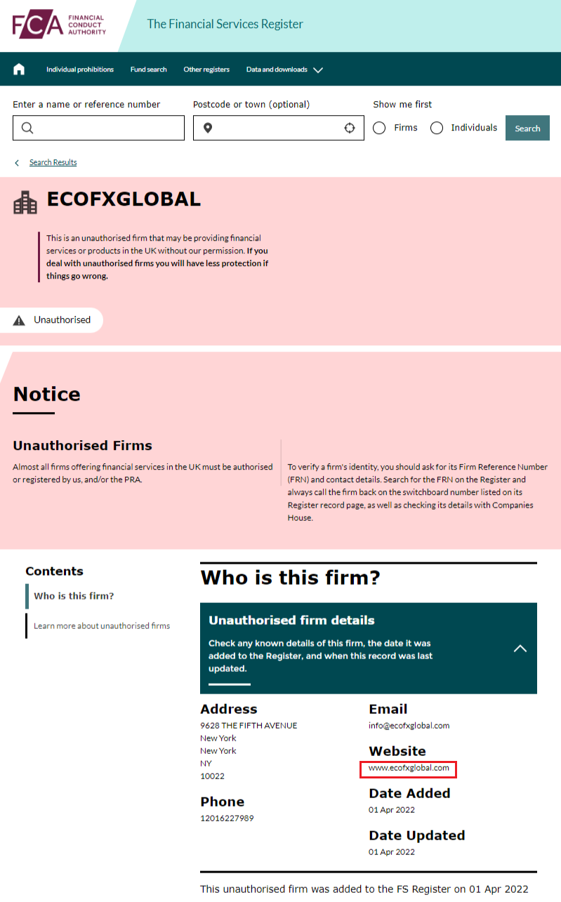 于是,我们在英国工商网分别输入“EcofxGlobal”及其注册号,但均未找到任何相关资料。反而,在FCA搜索“EcofxGlobal”,找到了一条警示信息,称其是“一家未经授权即非法提供金融服务的公司,请远离”。