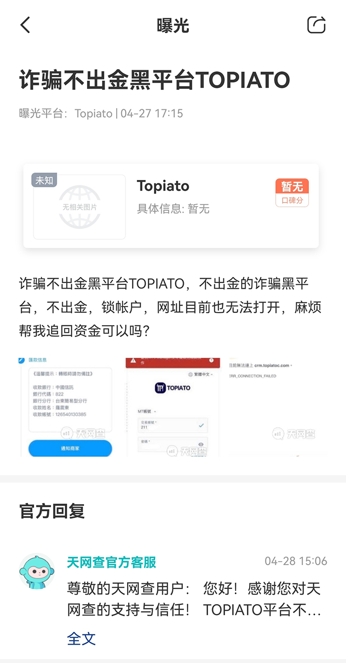 “不出金,锁账户,且平台网址无法打开。”这是最近天网查收到的一条用户对TOPIATO的投诉。